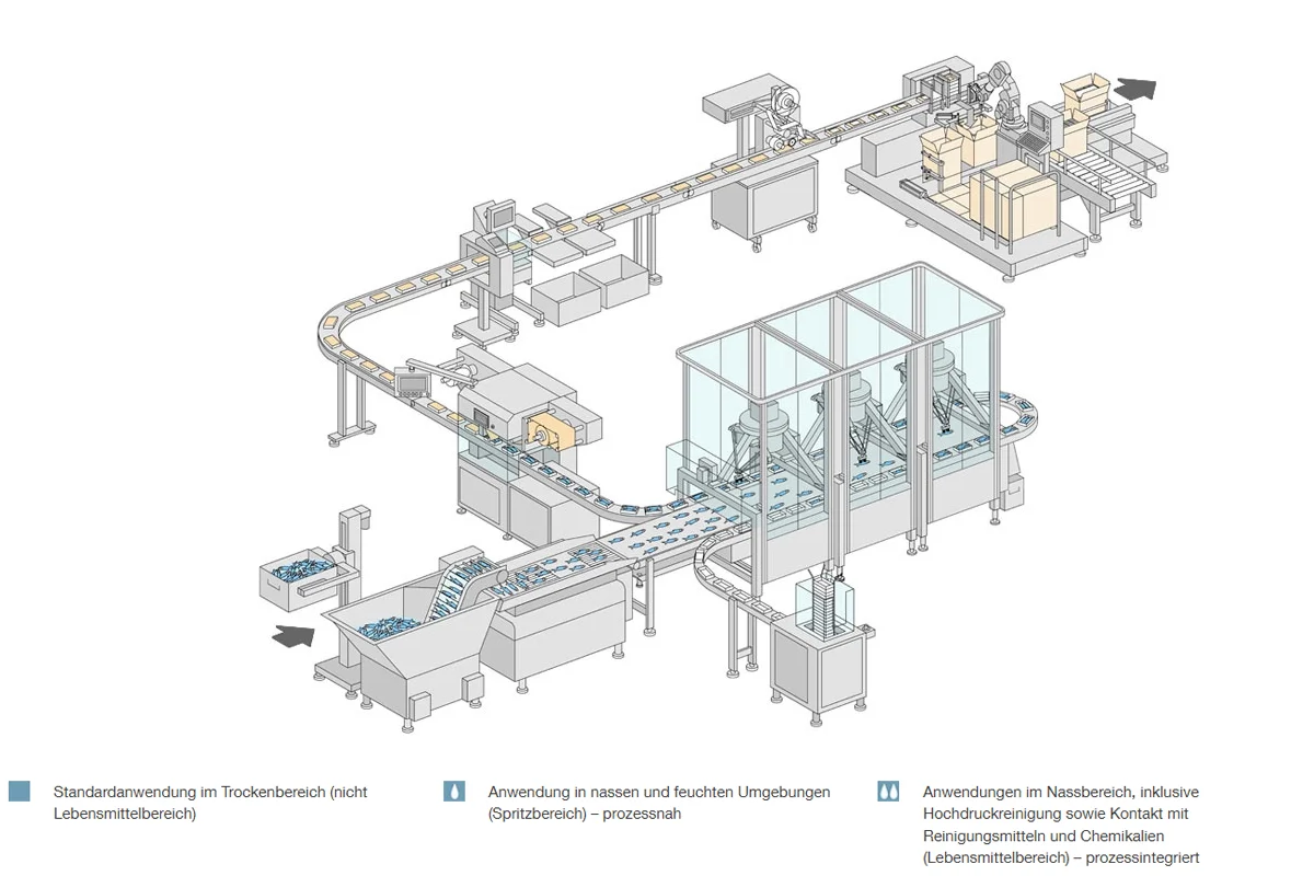 Für dynamische Prozesse (z. B. Greiferanwendungen) mit direktem Lebensmittelkontakt ist die cyber® dynamic line im Hygienic Design die optimale Lösung. Die Kleinservomotoren ermöglichen eine prozessnahe, hygienische und sterile Automatisierung.
