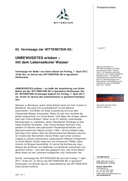 Die 65. Vernissage der WITTENSTEIN SE wird am Freitag, 7. April 2017, 19.00 Uhr, im Atrium der WITTENSTEIN SE in Igersheim-Harthausen von Roman Stauch, Geschäftsführer der WITTENSTEIN intens GmbH eröffnet.