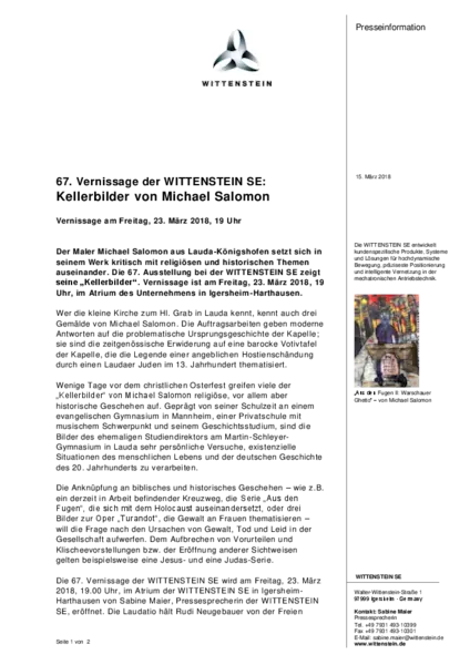 Die 67. Vernissage der WITTENSTEIN SE wird am Freitag, 23. März 2018, 19.00 Uhr, im Atrium der WITTENSTEIN SE in Igersheim-Harthausen von Sabine Maier, Pressesprecherin der WITTENSTEIN SE, eröffnet. Die Laudatio hält Rudi Neugebauer von der Freien Malschule Palette in Lauda-Königshofen. In die Kunstwerke führt Pfarrer Ralph Walterspacher, ebenfalls aus Lauda-Königshofen, ein. Für die musikalische Umrahmung sorgen Hans-Ulrich Nerger (Klavier) und Andreas Brasch (Klarinette).