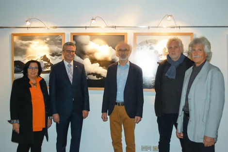 68. WITTENSTEIN-Vernissage (v.re.n.li.): Künstler Wolfgang Bautz, Künstler Nikolaus Seubert, Laudator Josef Seubert, Oliver Kössel (Personalleiter WITTENSTEIN SE) und Claudia Geier (Vernissagen, WITTENSTEIN SE).