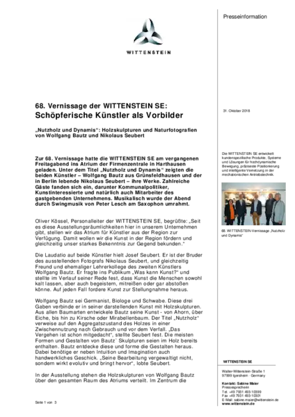 Zur 68. Vernissage hatte die WITTENSTEIN SE am vergangenen Freitagabend ins Atrium der Firmenzentrale in Harthausen geladen. Unter dem Titel „Nutzholz und Dynamis“ zeigten die beiden Künstler – Wolfgang Bautz aus Grünsfeldhausen und der in Berlin lebende Nikolaus Seubert – ihre Werke. Zahlreiche Gäste fanden sich ein, darunter Kommunalpolitiker, Kunstinteressierte und natürlich auch Mitarbeiter des gastgebenden Unternehmens. Musikalisch wurde der Abend durch Swingmusik von Peter Lesch am Saxophon umrahmt.