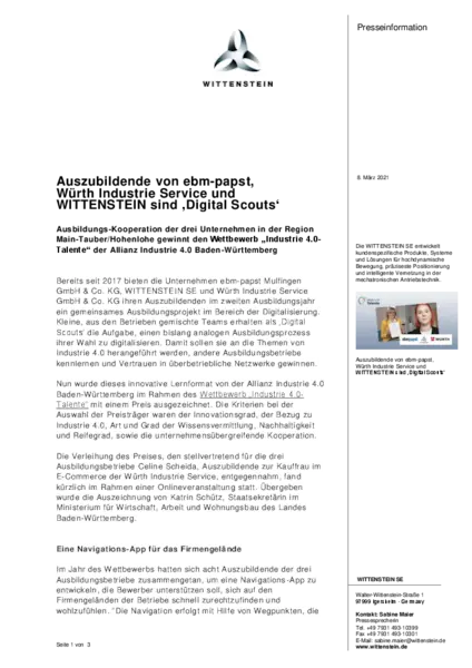 Bereits seit 2017 bieten die Unternehmen ebm-papst Mulfingen GmbH & Co. KG, WITTENSTEIN SE und Würth Industrie Service GmbH & Co. KG ihren Auszubildenden im zweiten Ausbildungsjahr ein gemeinsames Ausbildungsprojekt im Bereich der Digitalisierung. Kleine, aus den Betrieben gemischte Teams erhalten als ‚Digital Scouts‘ die Aufgabe, einen bislang analogen Ausbildungsprozess ihrer Wahl zu digitalisieren. Damit sollen sie an die Themen von Industrie 4.0 herangeführt werden, andere Ausbildungsbetriebe kennlernen und Vertrauen in überbetriebliche Netzwerke gewinnen.