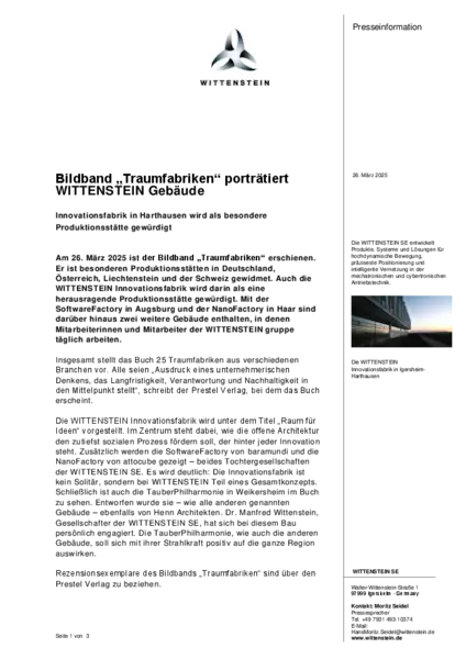 Am 26. März 2025 ist der Bildband „Traumfabriken“ erschienen. Er ist besonderen Produktionsstätten in Deutschland, Österreich, Liechtenstein und der Schweiz gewidmet. Auch die WITTENSTEIN Innovationsfabrik wird darin als eine herausragende Produktionsstätte gewürdigt. Mit der SoftwareFactory in Augsburg und der NanoFactory in Haar sind darüber hinaus zwei weitere Gebäude enthalten, in denen Mitarbeiterinnen und Mitarbeiter der WITTENSTEIN gruppe täglich arbeiten.
