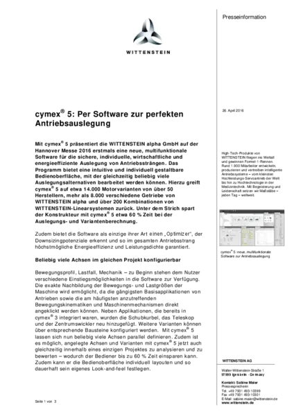 Bei der Auslegung greift cymex® 5 auf eine ständig aktualisierte Datenbank zu, in der etwa 14.000 Motorvarianten von über 50 Herstellern, mehr als 8.000 verschiedene Getriebe von WITTENSTEIN alpha sowie über 200 Kombinationen von WITTENSTEIN-Linearsystemen gelistet sind. Nach dem Geometrieabgleich leitet die Software individuelle Antriebskonfigurationen ab und schlägt automatisch passende Anbauteile vor. Zum Abschluss der Auslegung kann der Bediener direkt die komplette Berechnungsdokumentation zum Antriebsstrang generieren, Datenblätter für Getriebe und Motor erstellen und 2D- sowie 3D-CAD-Daten von Komponenten anfordern.