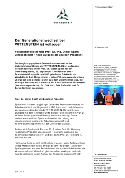 Unter dem Motto „Aufbruch. Beständig“ feierte der Mechatronikkonzern WITTENSTEIN am Donnerstagabend in gebührend feierlichem Rahmen einen unternehmerischen Meilenstein: den nun erfolgreich abgeschlossenen Übergabeprozess der Führungsverantwortung in die nächste Generation des Familienunternehmens. Nach dem Ausscheiden des langjährigen Vorstands Karl-Heinz Schwarz (31. März 2016) waren zum 1. April Dr. Anna-Katharina Wittenstein, Dr. Dirk Haft, Erik Roßmeißl und Dr. Bernd Schimpf neben Prof. Dr. Dieter Spath in den Vorstand berufen worden. Damit war es gelungen, das künftige Vorstandsgremium ausschließlich aus den eigenen Reihen zu formen – mit bewährten Führungskräften auch aus der Unternehmerfamilie heraus. Mit Ende der Übergangsphase scheidet der bisherige Vorsitzende Spath nun zum 30. September 2016 aus Vorstand und Unternehmen aus. Dr. Anna-Katharina Wittenstein übernimmt künftig die neue Position der Vorstandssprecherin.