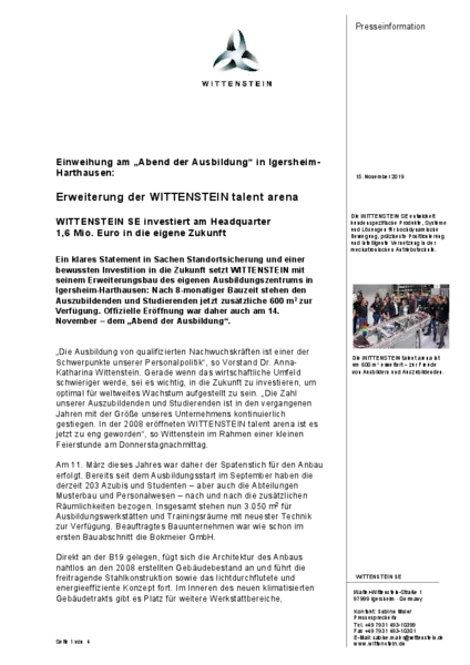 „Die Ausbildung von qualifizierten Nachwuchskräften ist einer der Schwerpunkte unserer Personalpolitik“, so Vorstand Dr. Anna-Katharina Wittenstein. Gerade wenn das wirtschaftliche Umfeld schwieriger werde, sei es wichtig, in die Zukunft zu investieren, um optimal für weltweites Wachstum aufgestellt zu sein. „Die Zahl unserer Auszubildenden und Studierenden ist in den vergangenen Jahren mit der Größe unseres Unternehmens kontinuierlich gestiegen. In der 2008 eröffneten WITTENSTEIN talent arena ist es jetzt zu eng geworden“, so WITTENSTEIN im Rahmen einer kleinen Feierstunde am Donnerstagnachmittag.