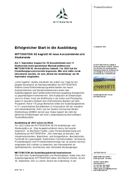 Am 1. September begann für 29 Auszubildende und 11 Studierende beim Igersheimer Mechatronikkonzern WITTENSTEIN SE die berufliche Zukunft. Für 2022 hat der Einstellungsprozess bereits begonnen. Wer sich dafür vorab informieren möchte, ist zum ‚Abend der Ausbildung‘ am 30. September eingeladen.
