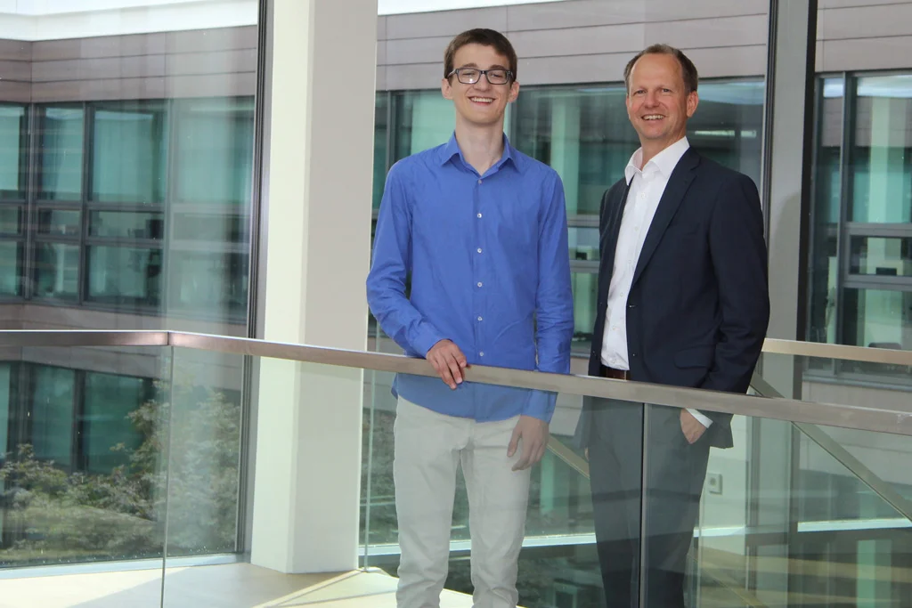 Ferdinand Elsner (links), 18-jähriger Abiturient aus Bad Mergentheim, ist Preisträger des WITTENSTEIN-Stipendiums 2017 – hier mit Dr. Michael Geier, Geschäftsführer der WITTENSTEIN cyber motor GmbH, in der Innovationsfabrik in Igersheim-Harthausen.