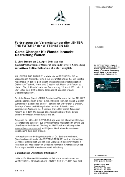 Mit „ENTER THE FUTURE“ startete die WITTENSTEIN SE im vergangenen November eine neue Veranstaltungsreihe, um künftig regelmäßig in der Region einem öffentlichen unternehmerischen Diskurs zu Technik, Natur und Gesellschaft Raum und Forum zu bieten. Die „2. Runde“ steht am Donnerstag, 22. April 2021, ab 16 Uhr, unter dem Motto „Game Changer KI: Wandel braucht Gestaltungswillen“.