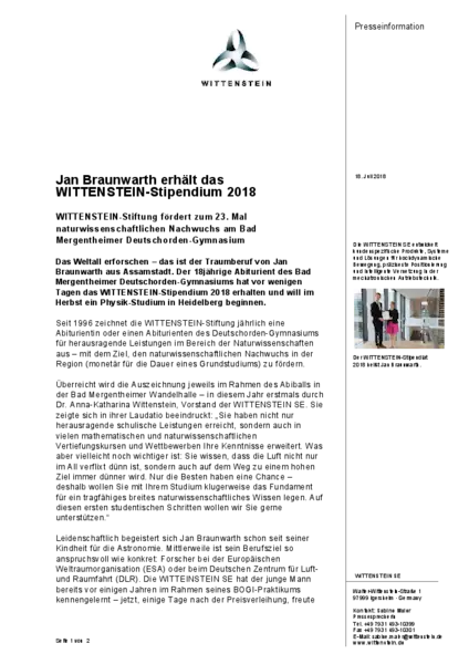Das Weltall erforschen – das ist der Traumberuf von Jan Braunwarth aus Assamstadt. Der 18jährige Abiturient des Bad Mergentheimer Deutschorden-Gymnasiums hat vor wenigen Tagen das WITTENSTEIN-Stipendium 2018 erhalten und will im Herbst ein Physik-Studium in Heidelberg beginnen.