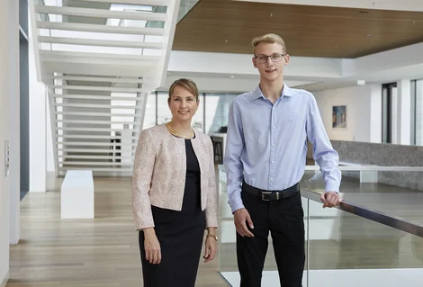 Jonathan Kohlschreiber, 18-jähriger Abiturient aus Igersheim, ist Preisträger des WITTENSTEIN-Stipendiums 2019 – im Bild mit Dr. Anna-Katharina Wittenstein, Vorstand der WITTENSTEIN SE, in der Innovationsfabrik in Igersheim-Harthausen.
