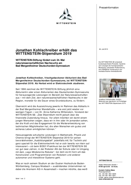 Jonathan Kohlschreiber erhält das WITTENSTEIN-Stipendium 2019