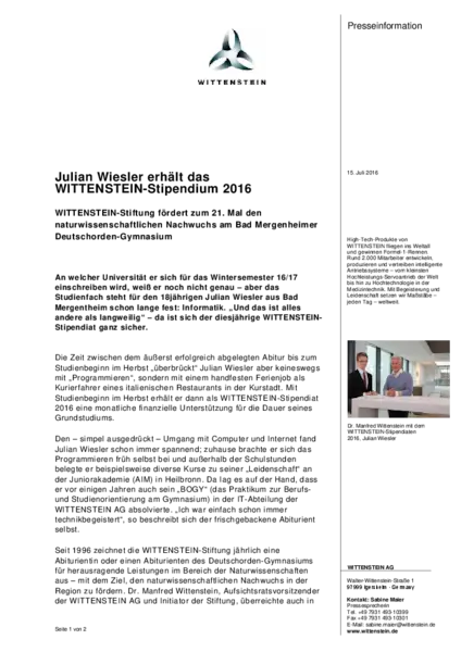 Julian Wiesler erhält das WITTENSTEIN-Stipendium 2016
