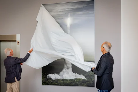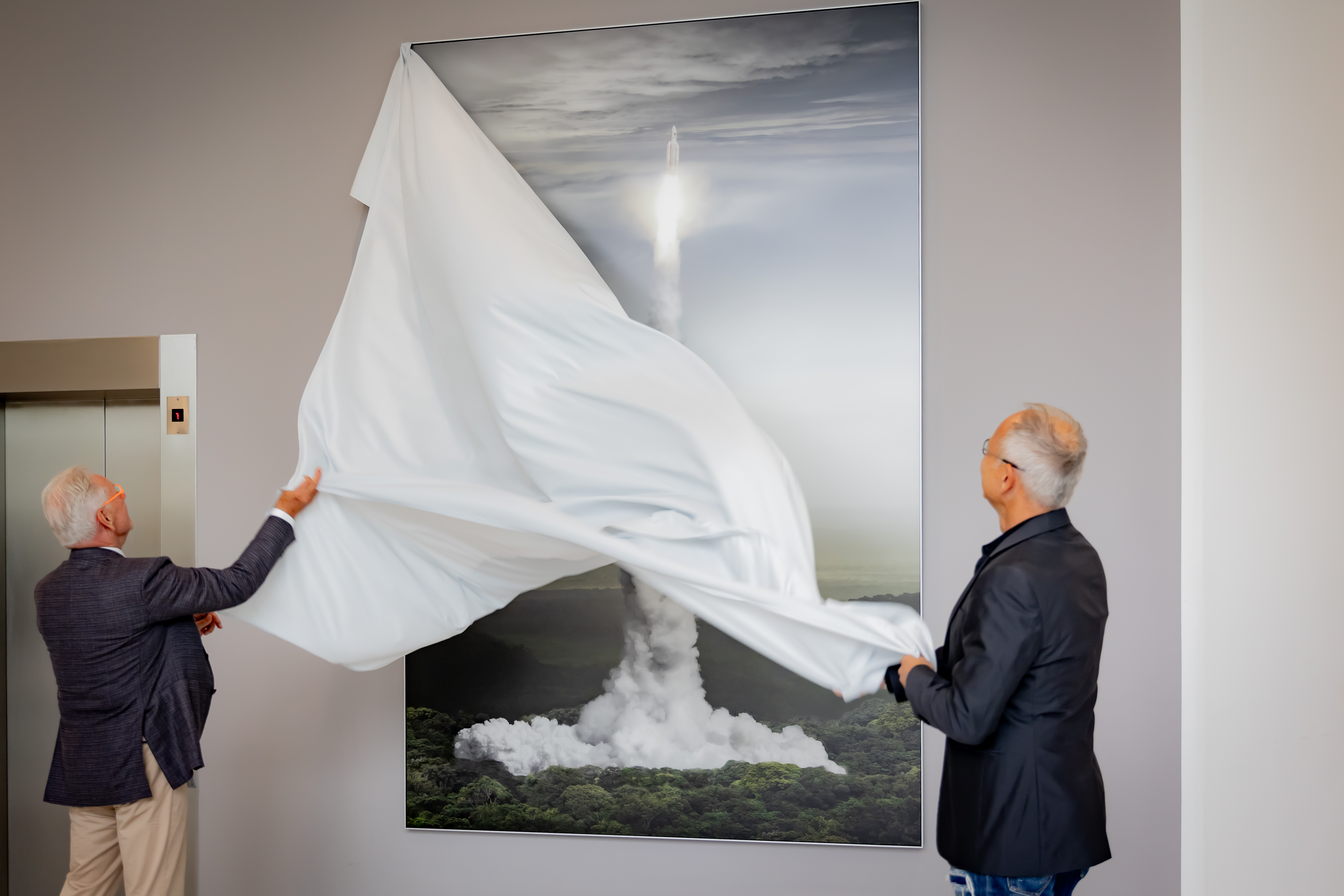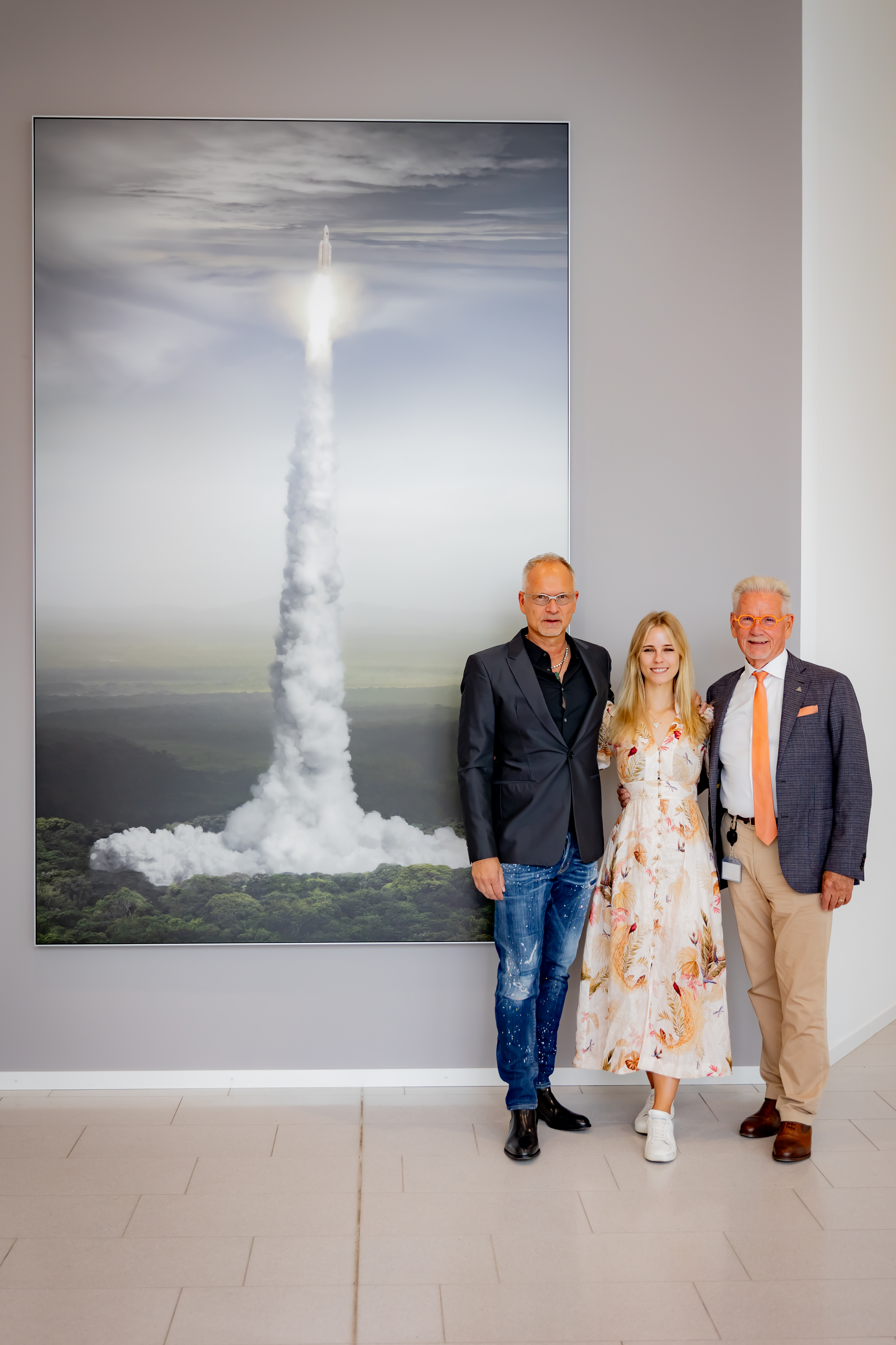 Orbital Ascent symbolisiert die Geisteshaltung von WITTENSTEIN. Die Fotografie zeigt eine Ariane-5-Rakete beim Start vom europäischen Weltraumbahnhof in Französisch-Guyana in Südamerika. Aus dem Amazonas-Urwald erhebt sie sich und strebt in den Weltraum. Aus einem der ältesten Ökosysteme des Planeten schicken wir Menschen sie dorthin – aus Neugier und um die Chancen zu ergreifen, die sich uns bieten. Beim ersten Anblick des Kunstwerks sei ihm klar gewesen: „Das gehört zu uns“, erzählt Dr. Manfred Wittenstein bei der Enthüllung.