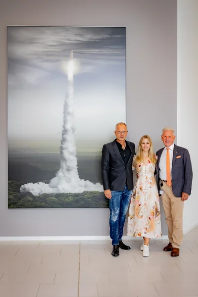 (v.l.n.r.: Michael Najjar, Künstler; Viktoria WITTENSTEIN, Dr. Manfred Wittenstein, beide Gesellschafter der WITTENSTEIN SE) - Bild 02: enthüllung-orbital-ascent-2.jpg