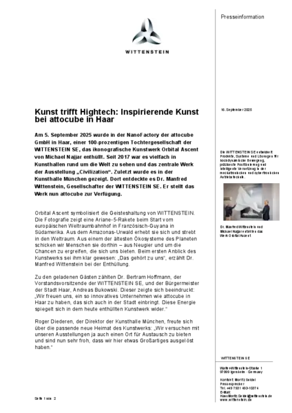 Zu den geladenen Gästen zählten Dr. Bertram Hoffmann, der Vorstandsvorsitzende der WITTENSTEIN SE, und der Bürgermeister der Stadt Haar, Andreas Bukowski. Dieser zeigte sich beeindruckt: „Wir freuen uns, ein so innovatives Unternehmen wie attocube in Haar zu haben, das sich auch in der Stadt einbringt. Diese Energie spiegelt sich in dem heute enthüllten Kunstwerk wider.“