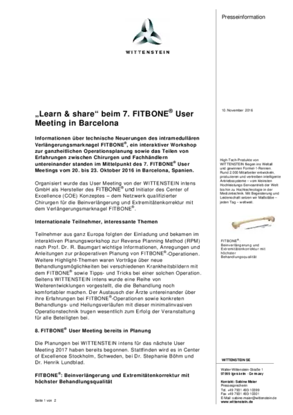 Organisiert wurde das User Meeting von der WITTENSTEIN intens GmbH als Hersteller des FITBONE® und Initiator des Center of Excellence (COE) Konzeptes – dem Netzwerk qualifizierter Chirurgen für die Beinverlängerung und Extremitätenkorrektur mit dem Verlängerungsmarknagel FITBONE®.