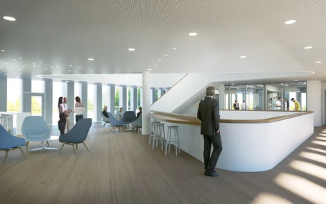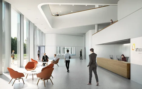 2. Außen- und Innenansichten des künftigen neuen Firmensitzes der attocube systems AG (Renderings: HENN Architekten)