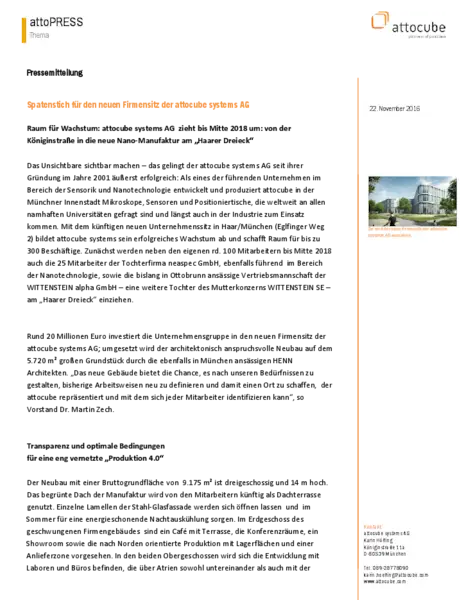 Das Unsichtbare sichtbar machen – das gelingt der attocube systems AG seit ihrer Gründung im Jahre 2001 äußerst erfolgreich: Als eines der führenden Unternehmen im Bereich der Sensorik und Nanotechnologie entwickelt und produziert attocube in der Münchner Innenstadt Mikroskope, Sensoren und Positioniertische, die weltweit an allen namhaften Universitäten gefragt sind und längst auch in der Industrie zum Einsatz kommen. Mit dem künftigen neuen Unternehmenssitz in Haar/München (Eglfinger Weg 2) bildet attocube systems sein erfolgreiches Wachstum ab und schafft Raum für bis zu 300 Beschäftige. Zunächst werden neben den eigenen rd. 100 Mitarbeitern bis Mitte 2018 auch die 25 Mitarbeiter der Tochterfirma neaspec GmbH, ebenfalls führend im Bereich der Nanotechnologie, sowie die bislang in Ottobrunn ansässige Vertriebsmannschaft der WITTENSTEIN alpha GmbH – eine weitere Tochter des Mutterkonzerns WITTENSTEIN SE – am „Haarer Dreieck“ einziehen.