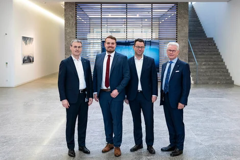 Bild 02: Gruppenbild im Foyer der WITTENSTEIN Innovationsfabrik (v.li.n.re): Dr. Bertram Hoffmann, Valentin Abel, Dr. Sebastian Schäfer und Dr. Manfred Wittenstein
