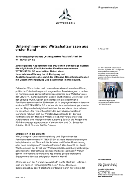 Zwei regionale Abgeordnete des Deutschen Bundestags nutzten die Möglichkeit, Einblicke in das Familienunternehmen WITTENSTEIN SE zu erhalten. Neben einer Unternehmensführung durch Fertigung und Ausbildungswerkstätte stand der intensive Gesprächsaustausch mit Unternehmensleitung und Eigentümer im Mittelpunkt.