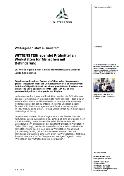 In gleich vier sozialen Einrichtungen ist nun die Freude über die nachhaltige Werkzeugspende groß, schließlich sind alle Geräte noch voll einsatzfähig: in der LebensWerkstatt für Menschen mit Behinderung e.V. (Heilbronn), bei den Mainfränkischen Werkstätten GmbH (Würzburg), bei der Johannes-Diakonie Mosbach (Buchener Werkstätten) und auch in den Caritas-Werkstätten Alois Eckert (Lauda-Königshofen). „Die Freude unserer Klienten über die Werkzeuge war wirklich sehr, sehr groß“, so Werkstattleiter Matthias Bausback bei der Vor-Ort-Übergabe vor wenigen Tagen in Lauda: „Wir können die Prüfmittel sehr gut gebrauchen.“