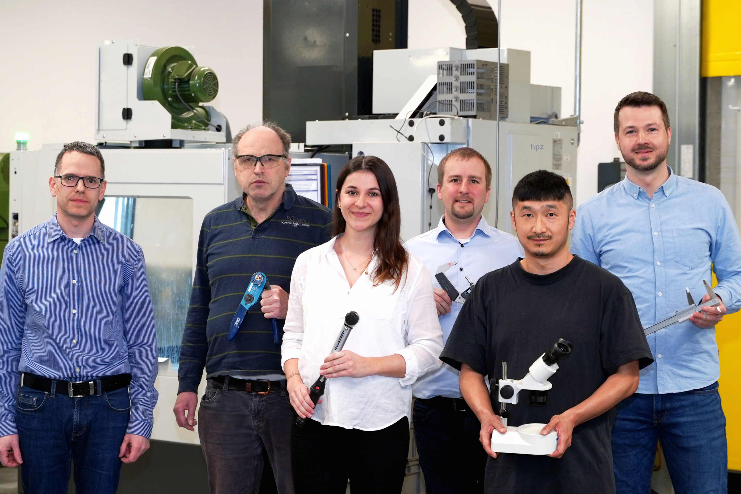 Freude über die Prüfmittelspende „frei Haus“ in den Caritas-Werkstätten Alois Eckert: (v.li.n.re.): Christoph Losert (Teamleiter Prüfmittelmanagement und Qualitätssicherung WITTENSTEIN alpha GmbH), Ludwig Kimmelmann (Beschäftigter der Caritas-Werkstätten), Leah Bleicher (Bereichsleitung Teilhabe der Caritas-Werkstätten), Matthias Bausback (Technischer Leiter der Caritas-Werkstätten), Jonas Stumptner (Beschäftigter der Caritas-Werkstätten) und Paul Weber (Werkstattleiter der Caritas-Werkstätten)