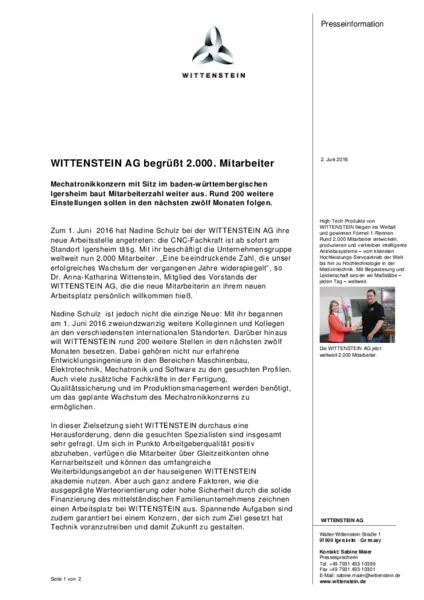 Zum 1. Juni 2016 hat Nadine Schulz bei der WITTENSTEIN AG ihre neue Arbeitsstelle angetreten: die CNC-Fachkraft ist ab sofort am Standort Igersheim tätig. Mit ihr beschäftigt die Unternehmensgruppe weltweit nun 2.000 Mitarbeiter. „Eine beeindruckende Zahl, die unser erfolgreiches Wachstum der vergangenen Jahre widerspiegelt“, so Dr. Anna-Katharina Wittenstein, Mitglied des Vorstands der WITTENSTEIN AG, die die neue Mitarbeiterin an ihrem neuen Arbeitsplatz persönlich willkommen hieß.