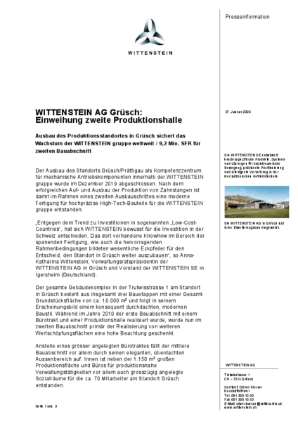 Der Ausbau des Standorts Grüsch/Prättigau als Kompetenzzentrum für mechanische Antriebskomponenten innerhalb der WITTENSTEIN gruppe wurde im Dezember 2019 abgeschlossen. Nach dem erfolgreichen Auf- und Ausbau der Produktion von Zahnstangen ist damit im Rahmen eines zweiten Ausbauschrittes eine moderne Fertigung für hochpräzise High-Tech-Bauteile für die WITTENSTEIN gruppe entstanden.