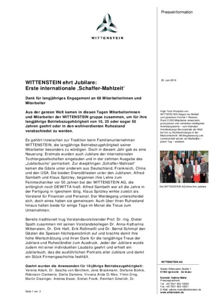WITTENSTEIN ehrt Jubilare: Erste internationale ‚Schaffer-Mahlzeit‘