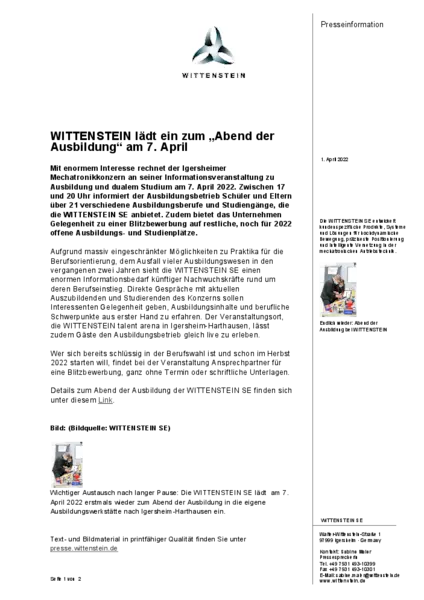 Wichtiger Austausch nach langer Pause: Die WITTENSTEIN SE lädt am 7. April 2022 erstmals wieder zum Abend der Ausbildung in die eigene Ausbildungswerkstätte nach Igersheim-Harthausen ein.