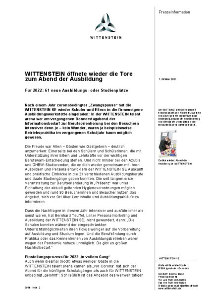 Auch wenn diesmal (noch) etwas weniger Gäste in die WITTENSTEIN talent arena kamen als „vor Corona“ hat sich der Abend für die künftigen Schulabgänger als auch für WITTENSTEIN unbedingt „gelohnt“: Schließlich ist das Angebot des weltweit tätigen Experten für mechatronische Antriebstechnik mit 21 verschiedenen Berufsbildern – sowohl kaufmännischen als auch technischen und IT-Berufen in Kooperation mit IHK und der Dualen Hochschule Baden-Württemberg – durchaus umfangreich. „Jetzt sich für 2022 noch bewerben macht auf jeden Fall Sinn“, so Dominik Pfister, Personalentwickler der WITTENSTEIN SE, bei seinem Vortrag während des Abends zum Thema ‚Erfolgreich zum Ausbildungs- und Studienplatz‘, denn man sei gerade erst mittendrin im Einstellungsprozess der 61 ‚Beginner‘, die für das nächste Jahr gesucht werden. Der bundesweite Trend sich bedauerlicherweise zeitlich ‚nach hinten‘ verschobener Bewerbungseingänge macht sich aber auch in Igersheim bemerkbar. Gesucht wird bei WITTENSTEIN insbesondere noch Nachwuchs als Industriemechaniker sowie als Maschinen- und Anlagenführer – Angebote zu Ausbildung oder Praktika gibt es unter www.wittenstein-jobs.de