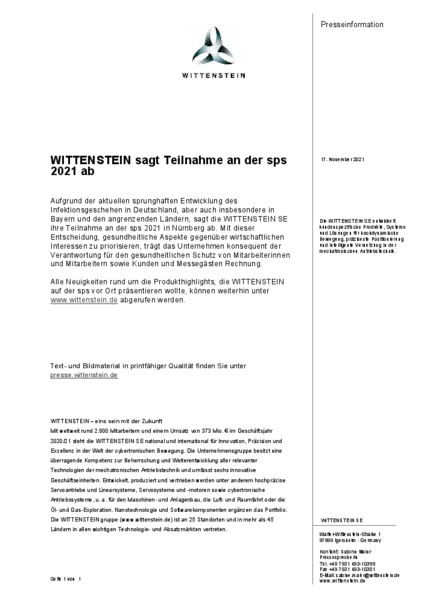 WITTENSTEIN sagt Teilnahme an der sps 2021 ab