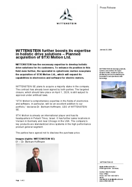 Die WITTENSTEIN SE plant die Übernahme der Mehrheit der Unternehmensanteile. Der Vertrag zwischen den beteiligten Partnern ist bereits geschlossen. Der angestrebte finale Vollzug zum 1. April 2026 steht unter Vorbehalt der kartellrechtlichen Freigaben.