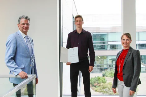 Fridolin Steinriede, 18-jähriger Abiturient aus Bad Mergentheim, ist Preisträger des WITTENSTEIN-Stipendiums 2020 – im Bild mit Dr. Anna-Katharina Wittenstein, Vorstand der WITTENSTEIN SE, und Schulleiter Christian Schlegl in der Innovationsfabrik in Igersheim-Harthausen.