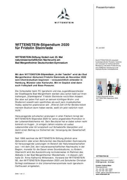 WITTENSTEIN-Stipendium 2020 für Fridolin Steinriede