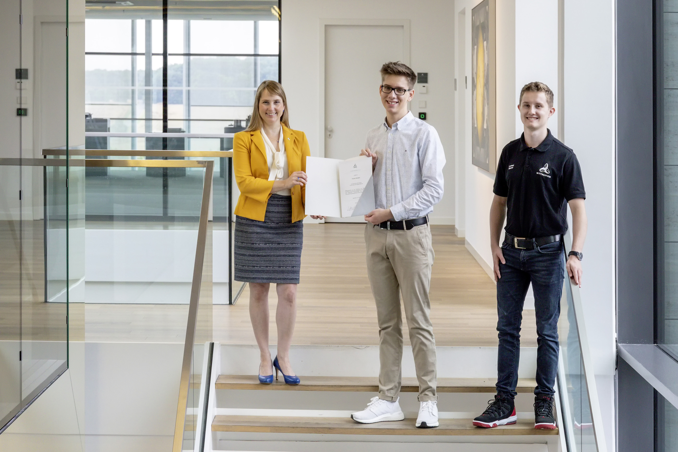 Florian Harslem (Bildmitte), 18-jähriger Abiturient aus Bad Mergentheim, ist der Preisträger des WITTENSTEIN-Stipendiums 2021 – im Bild mit Dr. Anna-Katharina Wittenstein (Vorstand der WITTENSTEIN SE) und Lennart Meurer, DHBW-Student der Elektrotechnik bei der WITTENSTEIN SE.