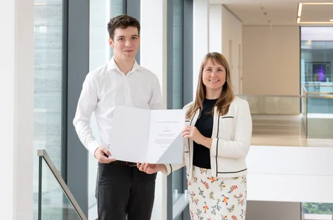 David Heck, Abiturient aus Bad Mergentheim, ist der Preisträger des WITTENSTEIN-Stipendiums 2022 – im Bild mit Dr. Anna-Katharina Wittenstein (Vorstand der WITTENSTEIN SE)