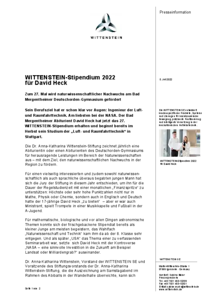 WITTENSTEIN-Stipendium 2022 für David Heck