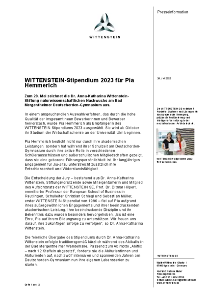 In einem anspruchsvollen Auswahlverfahren, das durch die hohe Qualität der insgesamt neun Bewerberinnen und Bewerber hervorstach, wurde Pia Hemmerich als Empfängerin des WITTENSTEIN-Stipendiums 2023 ausgewählt. Sie wird ab Oktober ihr Studium der Wirtschaftschemie an der Universität Ulm beginnen.