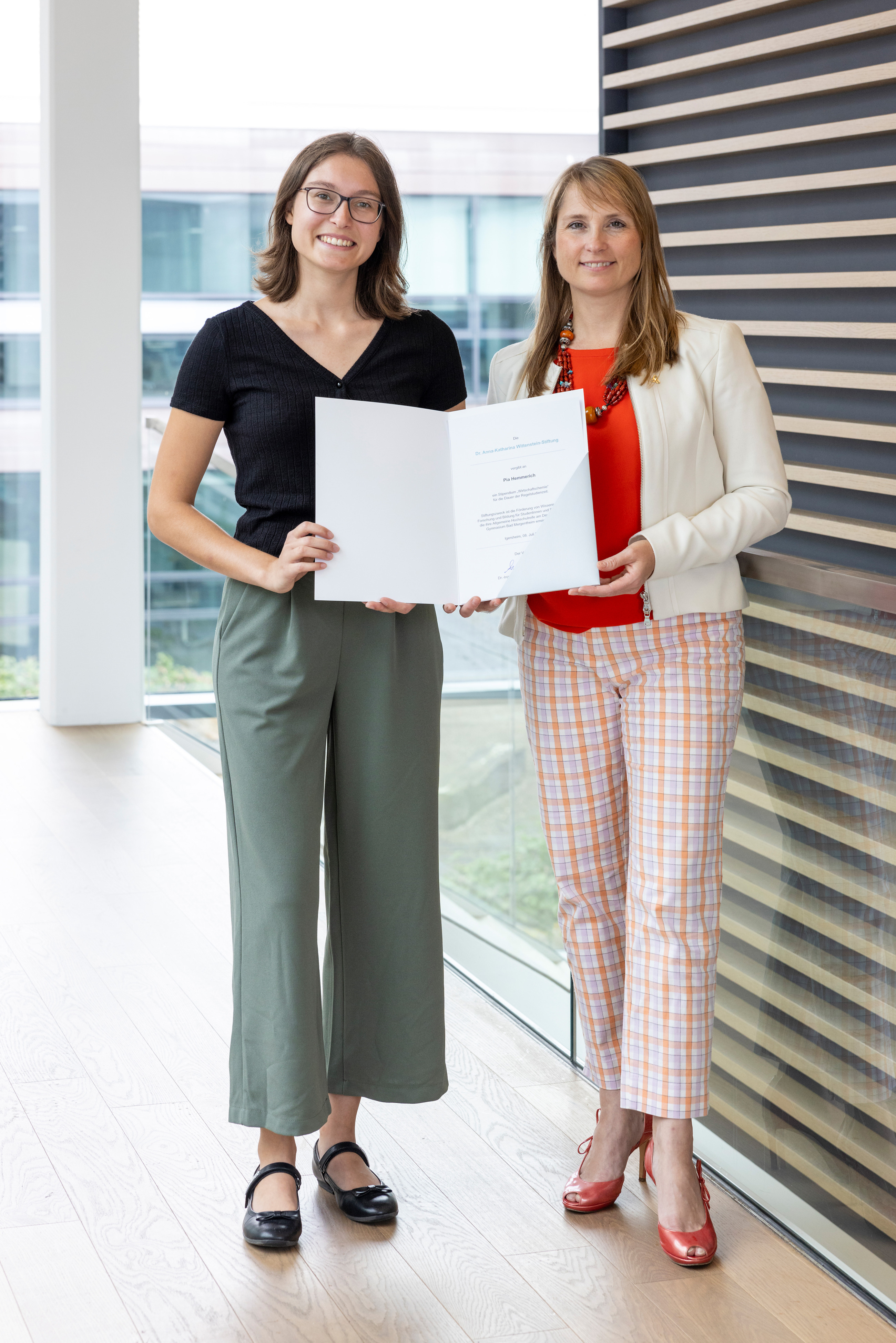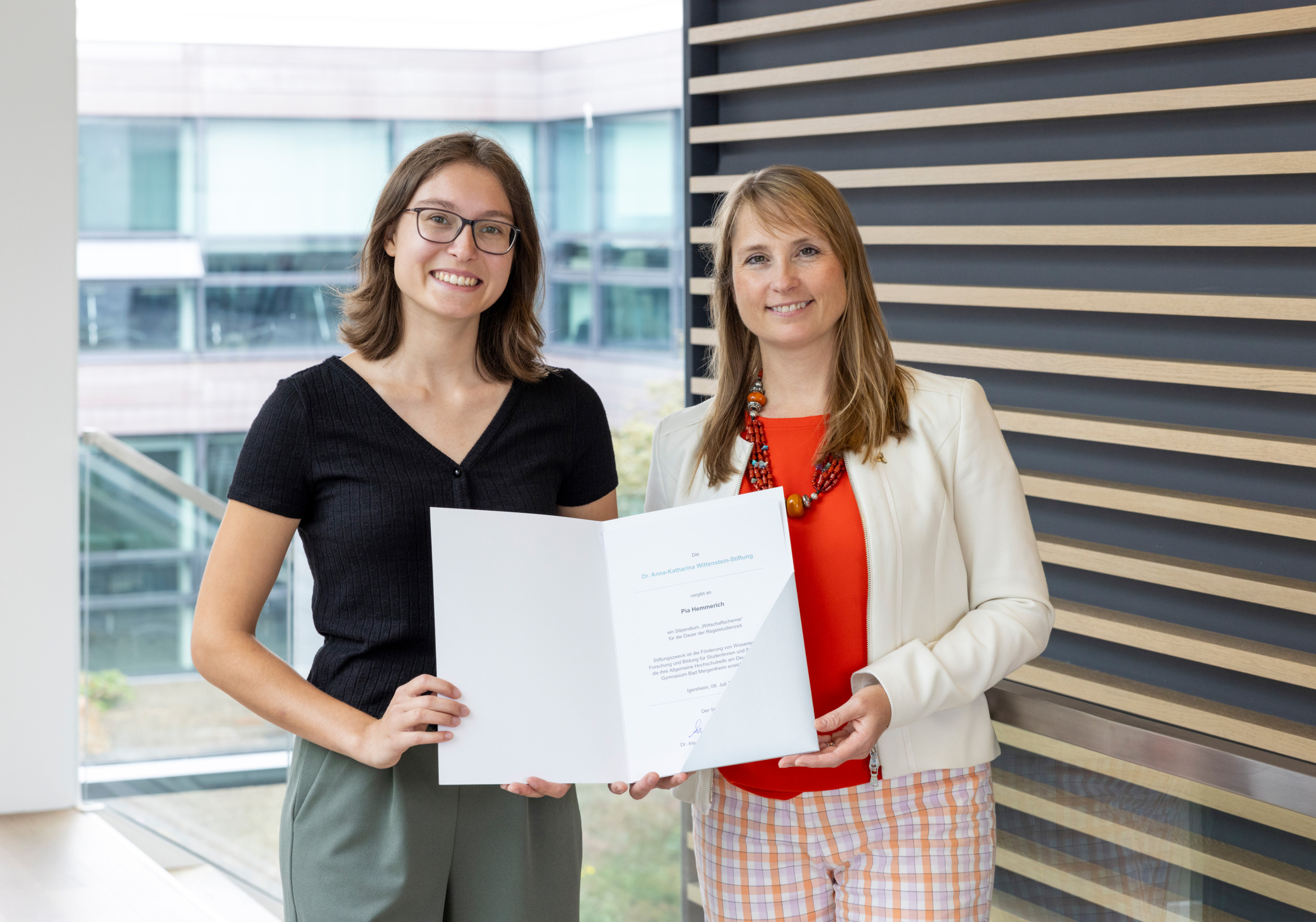 Abiturientin Pia Hemmerich ist die Preisträgerin des WITTENSTEIN-Stipendiums 2023 – im Bild mit Dr. Anna-Katharina Wittenstein.