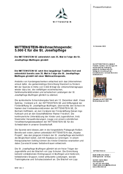 Die symbolische Scheckübergabe fand am 15. Dezember statt. Klaus Spitzley, Vorstand a.D. der WITTENSTEIN SE und Stiftungsrat der Förderstiftung St. Josefspflege Mulfingen, überreichte den Scheck im Namen des Vorstandsvorsitzenden der WITTENSTEIN SE, Dr. Bertram Hoffmann, an den Vorstand der Förderstiftung Dekan Ingo Kuhbach und an den Geschäftsführer Rainer Friedrich. Die kontinuierliche Unterstützung der Kinder und Jugendlichen, trotz finanzieller Herausforderungen, zeuge von einem vorbildlichen Verantwortungsbewusstsein der WITTENSTEIN SE für die Schwächsten in unserer Gesellschaft.