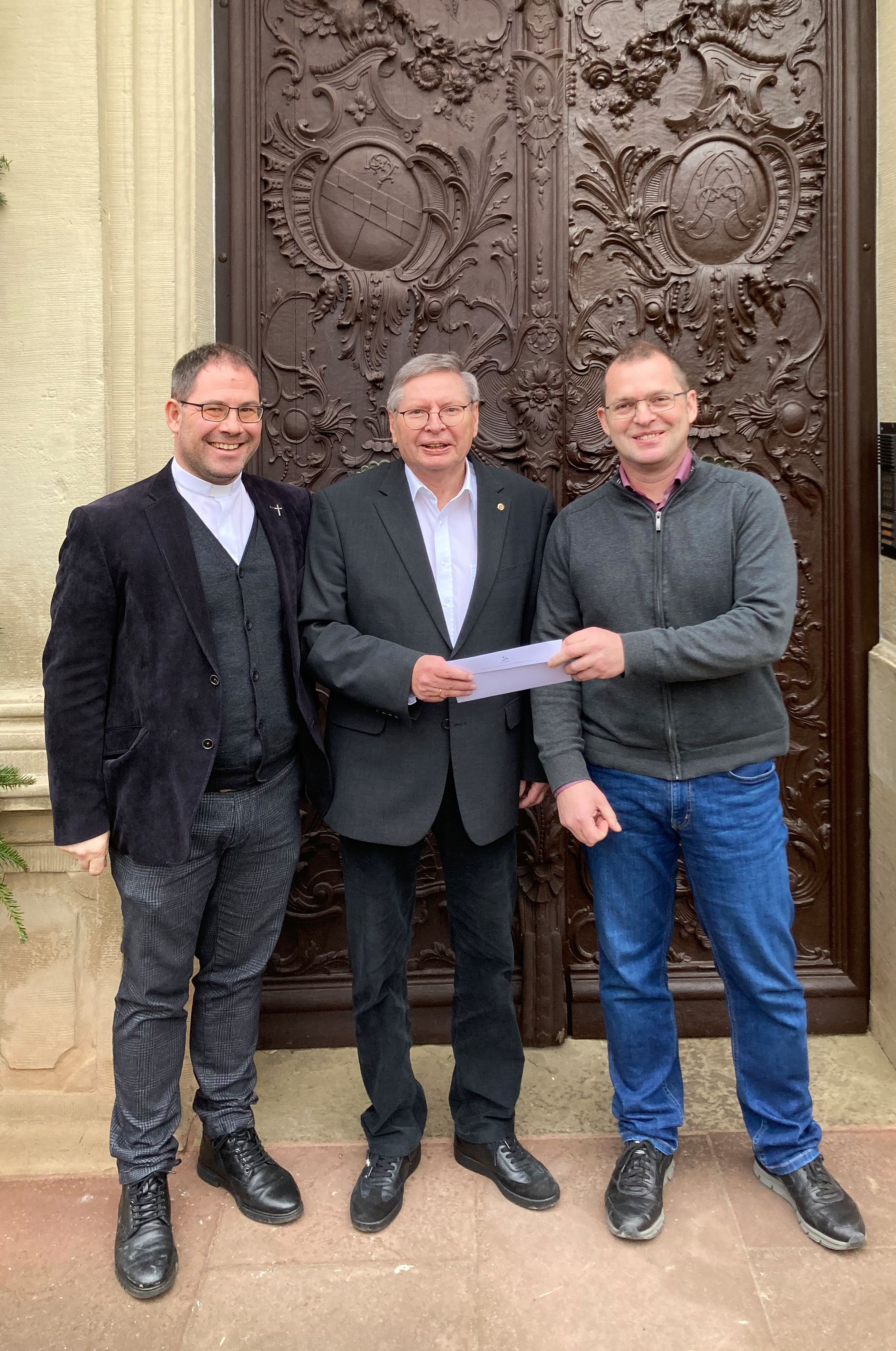 Seit 35 Jahren spendet WITTENSTEIN zu Weihnachten anstelle von Kundengeschenken an die St. Josefspflege Mulfingen gGmbH: Klaus Spitzley (Mitte, Vorstand a.D. der WITTENSTEIN SE) übereichte den Scheck über 5.000 € an Dekan Ingo Kuhbach (links) und Rainer Friedrich (Geschäftsführer St. Josefspflege Mulfingen gGmbH)
