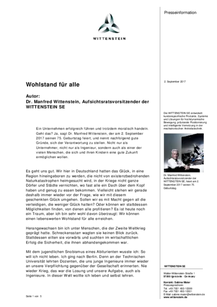 Ein Unternehmen erfolgreich führen und trotzdem moralisch handeln. Geht das? Ja, sagt Dr. Manfred Wittenstein, der am 2. September 2017 seinen 75. Geburtstag feiert, und nennt nachfolgend gute Gründe, sich der Verantwortung zu stellen. Nicht nur als Unternehmer, nicht nur als Ingenieur, sondern auch als einer der vielen Menschen, die sich und ihren Kindern eine gute Zukunft ermöglichen wollen.