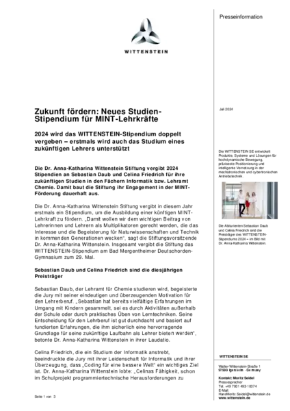 Die Dr. Anna-Katharina Wittenstein Stiftung vergibt 2024 Stipendien an Sebastian Daub und Celina Friedrich für ihre zukünftigen Studien in den Fächern Informatik bzw. Lehramt Chemie. Damit baut die Stiftung ihr Engagement in der MINT-Förderung dauerhaft aus.