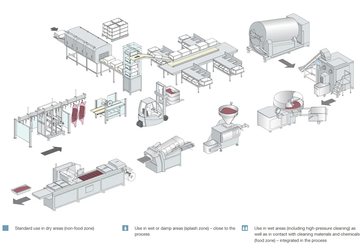 In the meat processing industry, daily cleaning is essential to prevent germs and bacteria from building up inside the machines. WITTENSTEIN can supply optimized, highly reliable products to meet a wide range of hygienic requirements on the complete production line. Engineers can thus design their machines according to an open concept and dispense with complicated enclosures.