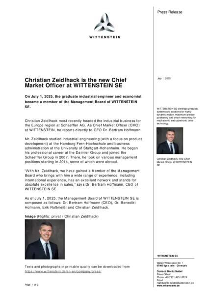 “With Mr. Zeidlhack, we have gained a Member of the Management Board who brings with him a wide range of experience, including international experience, has an excellent network and stands for absolute excellence in sales,” says Dr. Bertram Hoffmann, CEO of WITTENSTEIN SE.