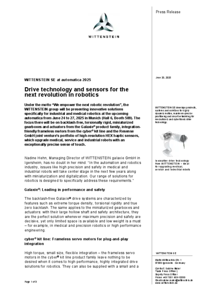 Under the motto “We empower the next robotic revolution”, the WITTENSTEIN group will be presenting innovative solutions specifically for industrial and medical robotics at the upcoming automatica from June 24 to 27, 2025 in Munich (Hall 6, Booth 509). The focus there will be on backlash-free, torsionally rigid, miniaturized gearboxes and actuators from the Galaxie® product family, integration-friendly frameless motors from the cyber® kit line and the Resense GmbH joint venture’s portfolio of high-resolution HEX haptic sensors, which upgrade medical, service and industrial robots with an exceptionally precise sense of touch.