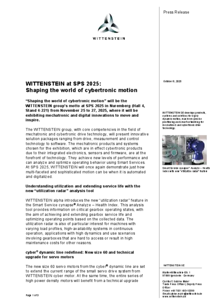 The WITTENSTEIN group, with core competencies in the field of mechatronic and cybertronic drive technology, will present innovative solution packages ranging from drive, measurement and control technology to software. The mechatronic products and systems chosen for the exhibition, which are in effect cybertronic products due to their integrated electronics, sensors and firmware, are at the forefront of technology. They achieve new levels of performance and can analyze and optimize operating behavior using Smart Services. At SPS 2025, WITTENSTEIN will once again demonstrate just how multi-faceted and sophisticated motion can be when it is automated and digitalized.