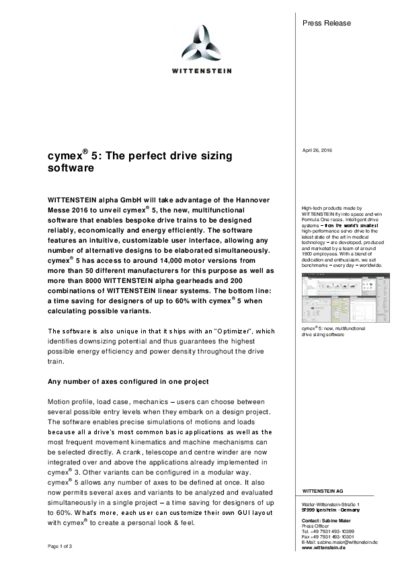 WITTENSTEIN alpha GmbH will take advantage of the Hannover Messe 2016 to unveil cymex® 5,…